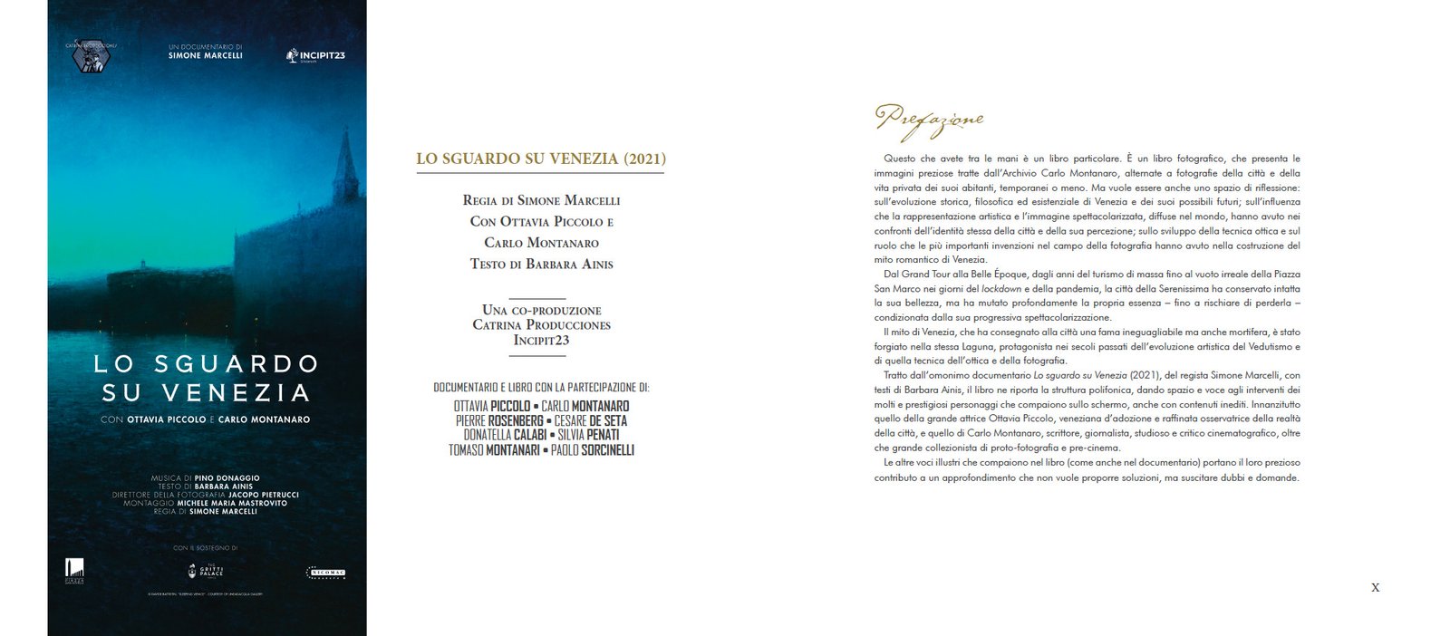 Lo sguardo su Venezia, tratto dal documentario omonimo (Catrina Producciones e Incipit23, 2021) è un libro da sfogliare, osservare e leggere. Presenta le immagini preziose tratte dall’Archivio Carlo Montanaro, alternate a fotografie di Barbara Ainis e altri fotografi che ritraggono la città lagunare e la vita privata dei suoi abitanti, temporanei o meno. Ma questo curatissimo volume è anche uno spazio di riflessione. L’autrice conduce il lettore in una riflessione storica, filosofica ed esistenziale su Venezia e sui suoi possibili futuri, dando spazio e voce agli interventi di molti e prestigiosi personaggi del panorama culturale internazionale con contenuti inediti. Innanzitutto quello della grande attrice Ottavia Piccolo, veneziana d’adozione e raffinata osservatrice della realtà della città che ne firma l’introduzione, e quello di Carlo Montanaro, studioso e critico cinematografico, oltre che grande collezionista di proto-fotografia e pre-cinema, che approfondisce il tema dell’evoluzione tecnica dell’immagine e della rappresentazione.