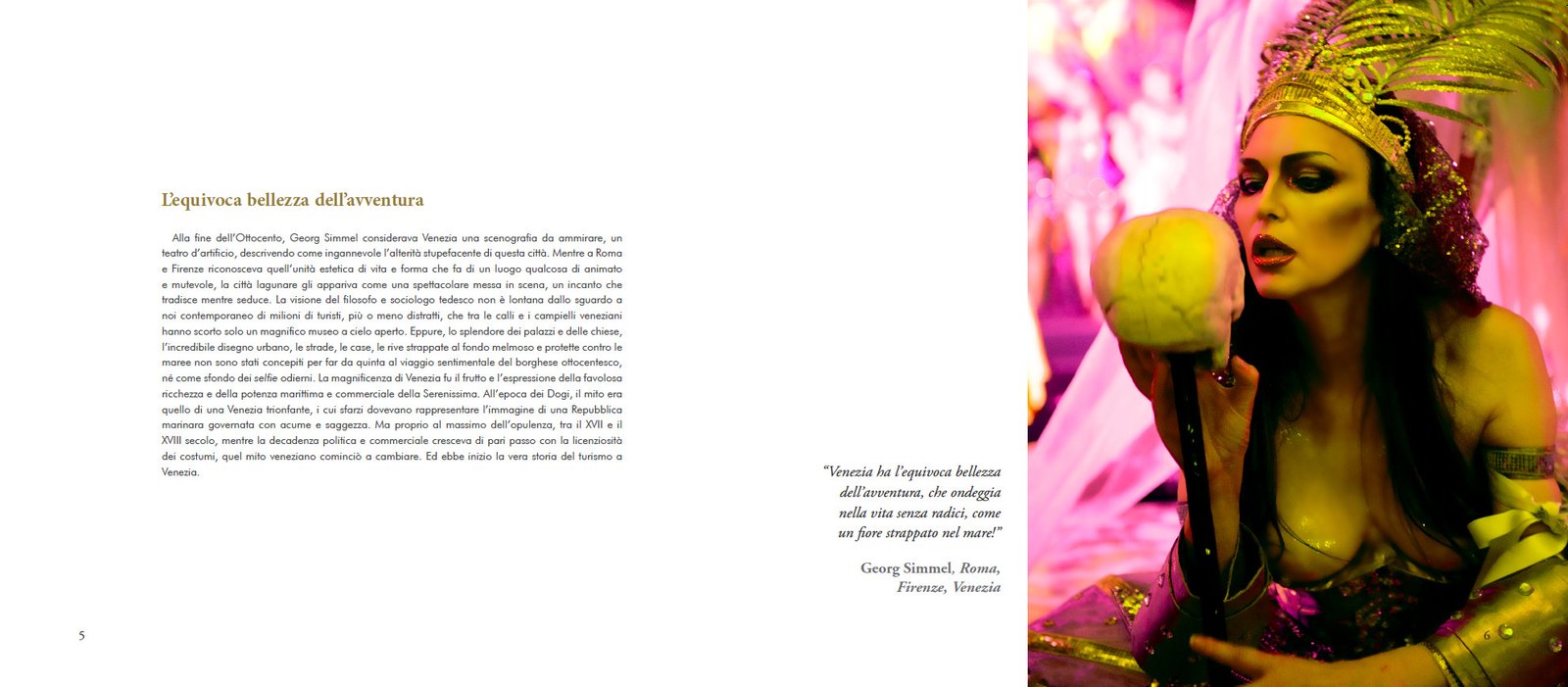 Inutile cercarla nei riflessi dei canali. Non la si trova neppure nel miraggio sospeso e senza tempo dei palazzi, sui suoi ponti o sull’acqua attraversata dalle gondole. Quel che si vede, quello che si crede di cogliere, non è che l’illusione della sua immagine. È la raffigurazione di un mito, di una città che, moderna come nessun’altra, ha trovato da secoli nella rappresentazione di se stessa il suo prodotto e la sua fortuna. Ma così facendo, col tempo ha smarrito la propria identità.